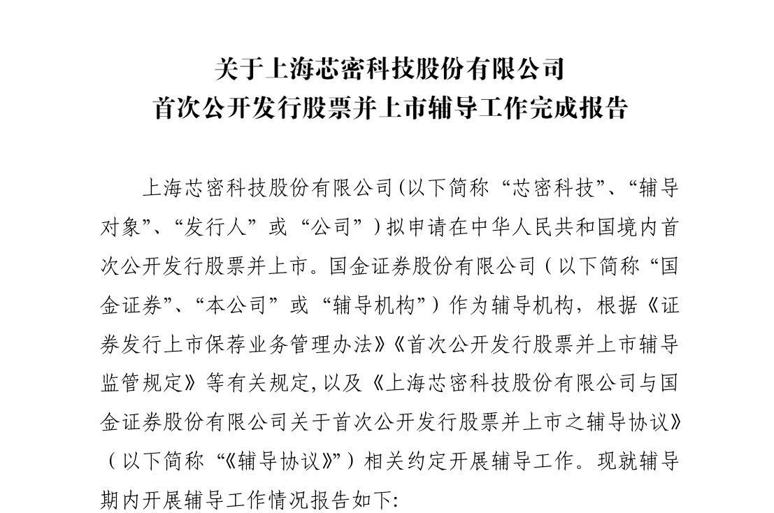 上证报中国证券网讯(记者郑维汉)近日,证监会披露平台显示,上海芯密科技股份有限公司(简称“芯密科技”)已完成上市辅导工作。据悉,芯密科技于2025年1月14日签署辅导协议,辅导机构为国金证券股份有限公司(简称“国金证券”)。国金证券称,芯密科技具备成为上市公司应有的公司治理结构、会计基础工作、内部控制制度等。